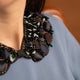 Centinaia di perline e micro-decorazioni, applicate una ad una su un morbido tessuto di cotone, ricreano il raffinato disegno di un merletto. Un colletto total black, costellato da preziosi punti luce riflettenti: è la magia di una notte stellata, è la bellezza di un accessorio sostenibile.